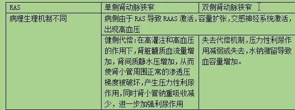 一侧肾动脉狭窄可以导致对侧肾脏灌注压升高,使髓质血流量增加及肾小管重吸收钠减少。髓质血流量增加使肾间质的静水压增加,从而使肾小管周围的正常渗透梯度破坏,产生利尿作用。对侧肾的利尿及利钠有利血压下降,但会加重狭窄侧肾脏的灌注不足,使RAS不断得到活化。双侧肾动脉狭窄和单肾肾动脉狭窄与单侧肾动脉狭窄不同,不存在正常侧或非狭窄侧对系统高血压的反应,出现容量扩张及水钠潴留,实际上抑制RAS的反馈效应,其高血压不是肾素依赖性,随着容量进一步扩张,严重可以导致肺水肿(心力衰竭)。